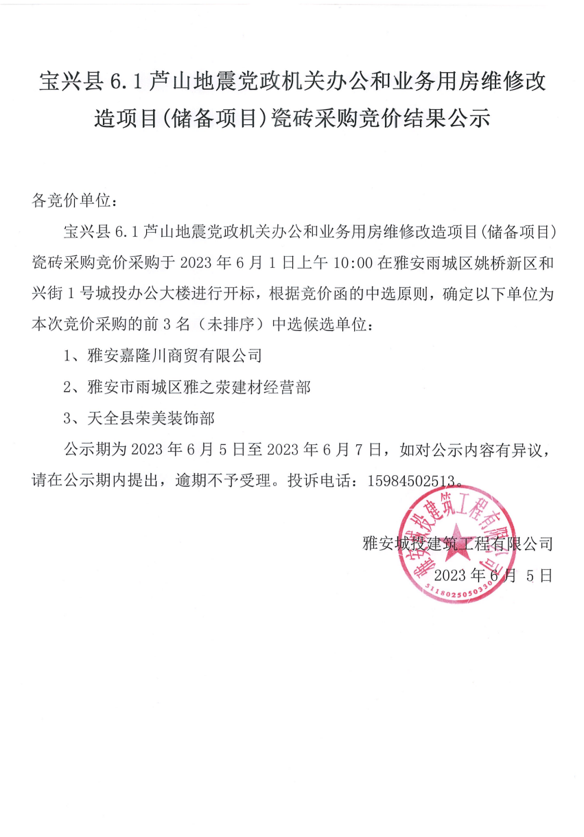 寶興縣6.1蘆山地震黨政機(jī)關(guān)辦公和業(yè)務(wù)用房維修改造項(xiàng)目(儲備項(xiàng)目)瓷磚采購競價(jià)結(jié)果公示