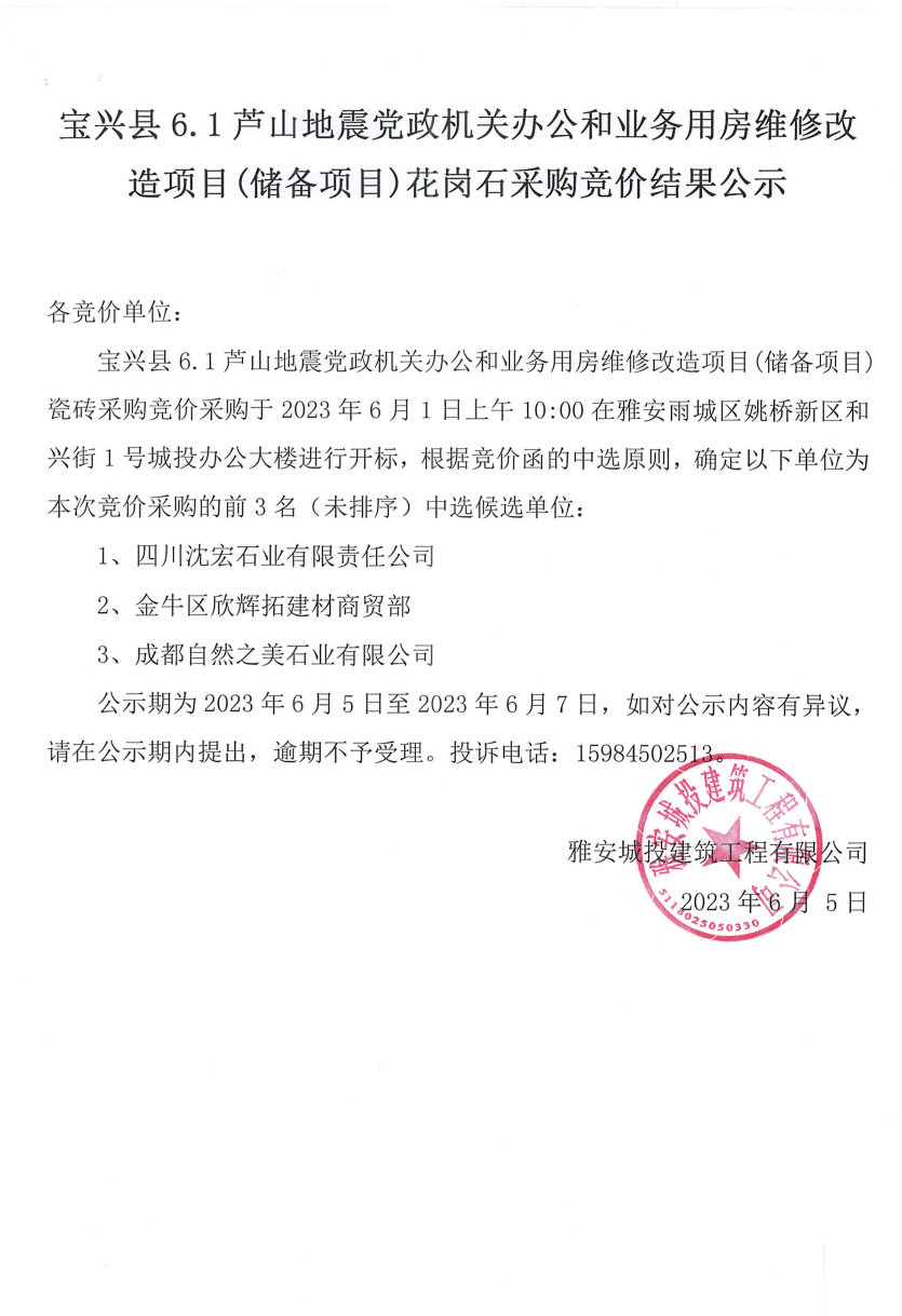 寶興縣6.1蘆山地震黨政機(jī)關(guān)辦公和業(yè)務(wù)用房維修改造項(xiàng)目(儲(chǔ)備項(xiàng)目)花崗石采購(gòu)競(jìng)價(jià)結(jié)果公示