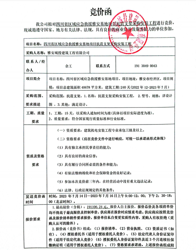 四川省區(qū)域應(yīng)急救援雅安基地項(xiàng)目抗震支架采購安裝工程競(jìng)價(jià)公告