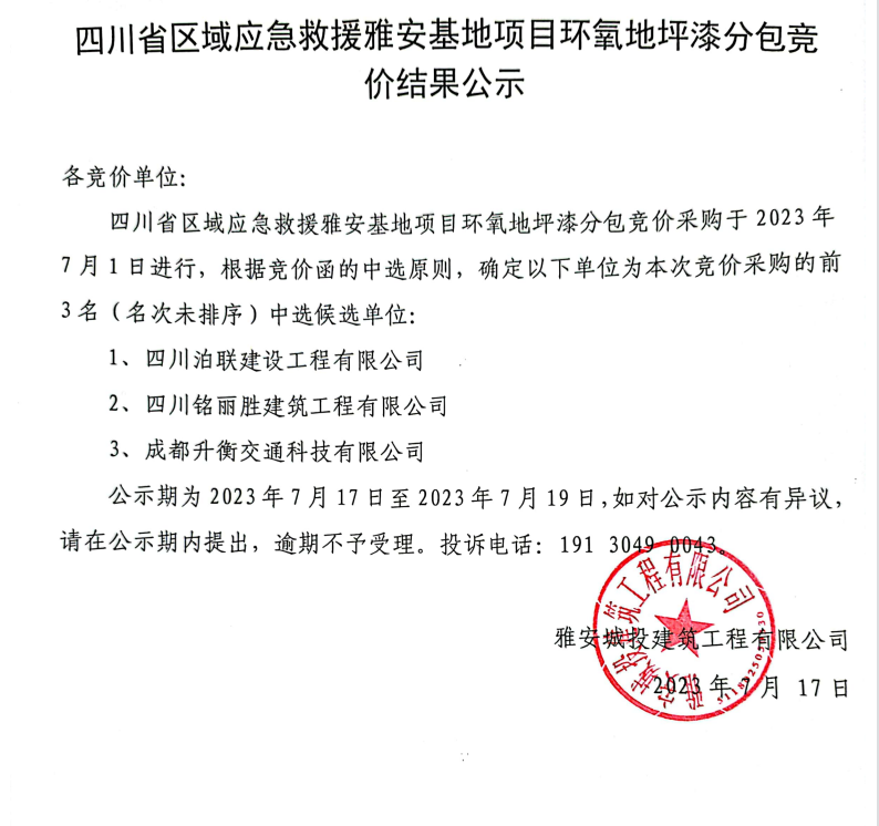 四川省區(qū)域應急救援雅安基地項目環(huán)氧地坪漆分包競價結果公示