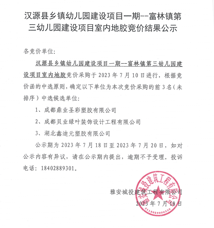 漢源縣鄉(xiāng)鎮(zhèn)幼兒園建設(shè)項(xiàng)目一期--富林鎮(zhèn)第三幼兒園建設(shè)項(xiàng)目室內(nèi)地膠競價(jià)結(jié)果公示