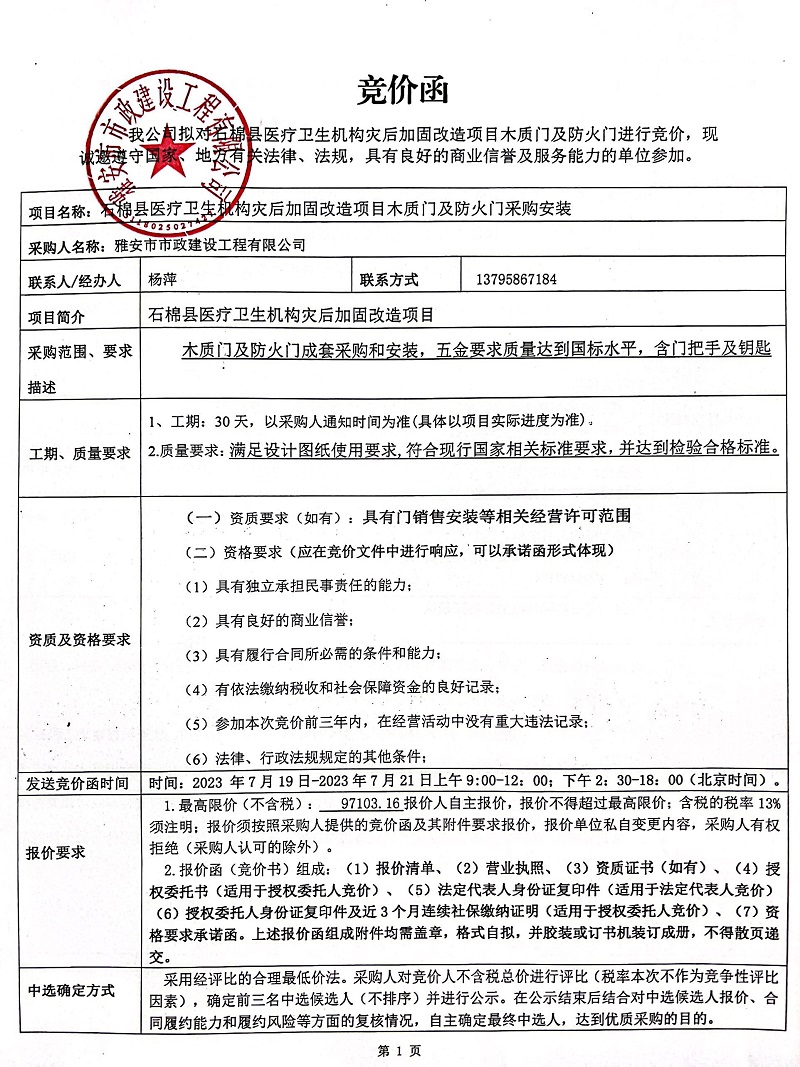 石棉縣醫(yī)療衛(wèi)生機(jī)構(gòu)災(zāi)后加固改造項目木質(zhì)門及防火門采購安裝競價公告