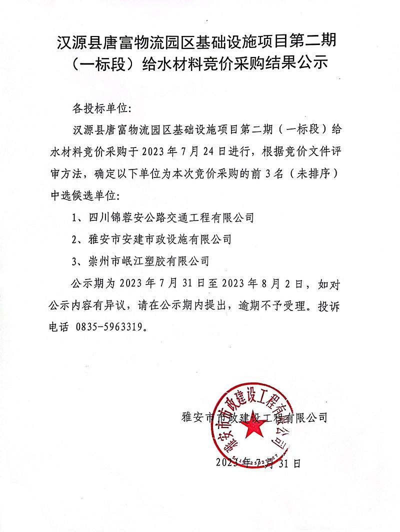 漢源縣唐富物流園區(qū)基礎設施項目第二期(一標段)給水材料競價采購結果公示