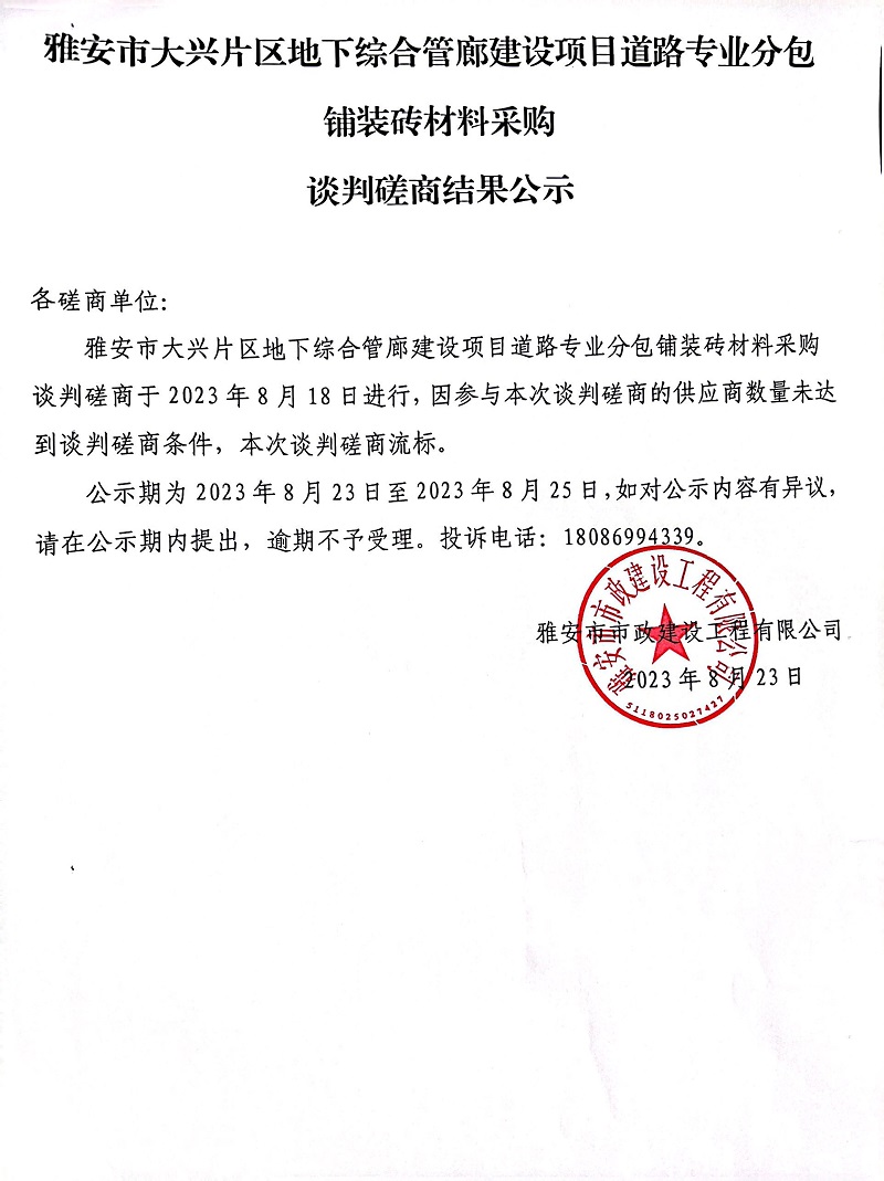 雅安市大興片區(qū)地下綜合管廊建設(shè)項目道路專業(yè)分包鋪裝磚材料采購談判磋商結(jié)果公示