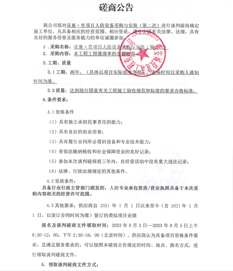 花襄·里項目人防設備采購與安裝(第二次)談判磋商公告