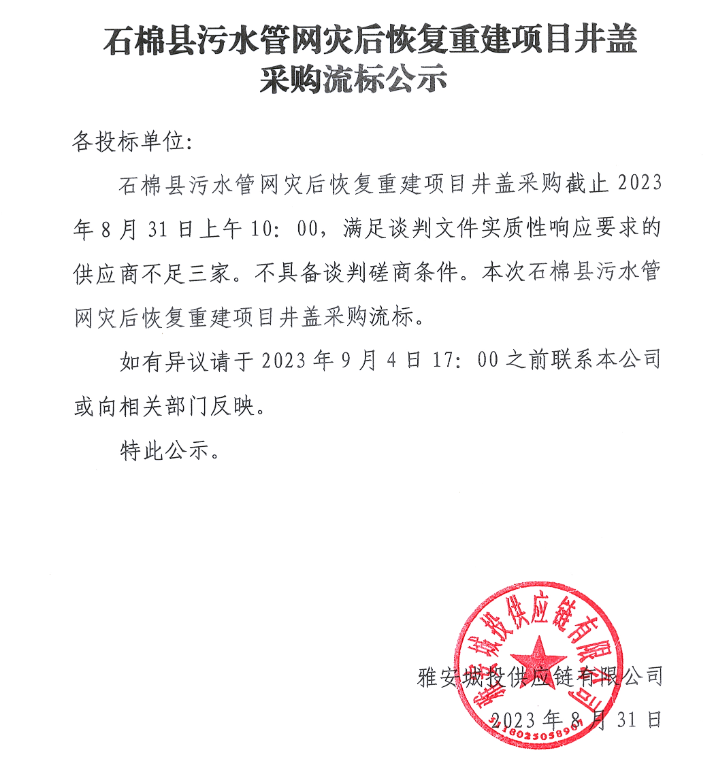 石棉縣污水管網(wǎng)災(zāi)后恢復(fù)重建項(xiàng)目井蓋采購(gòu)流標(biāo)公示