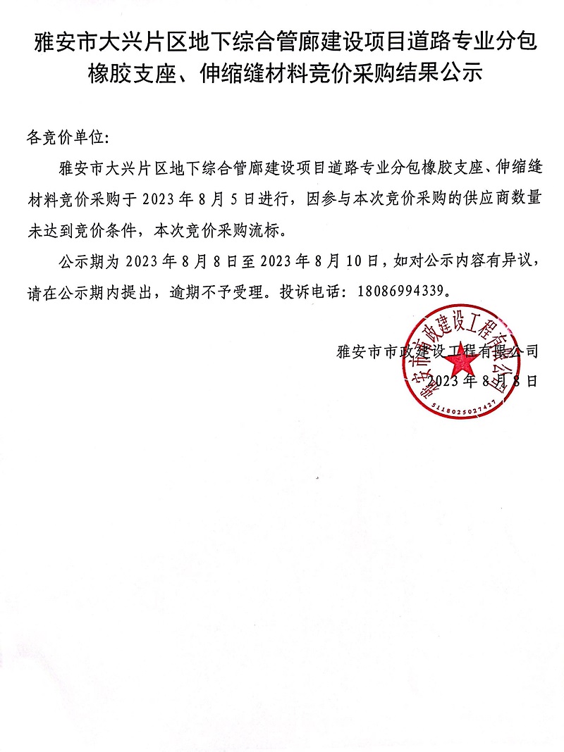 雅安市大興片區(qū)地下綜合管廊建設(shè)項(xiàng)目道路專業(yè)分包橡膠支座、伸縮縫材料競(jìng)價(jià)采購(gòu)結(jié)果公示