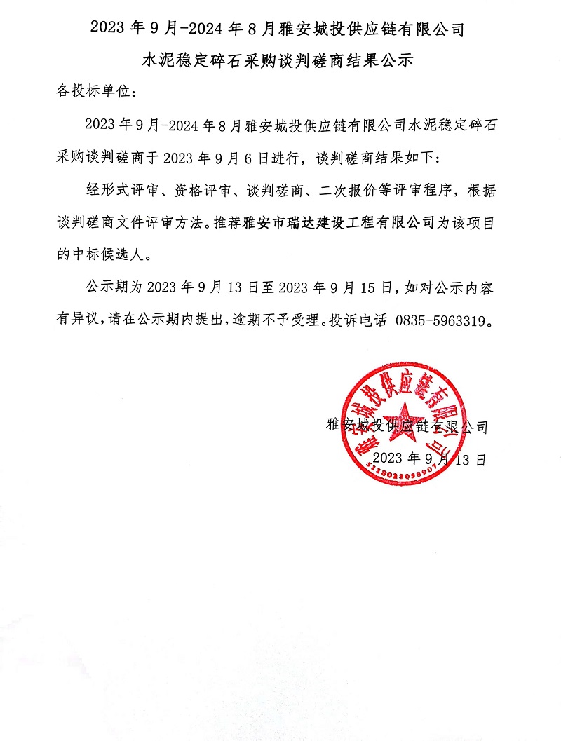 2023年9月-2024年8月雅安城投供應鏈有限公司水泥穩(wěn)定碎石采購談判磋商結果公示