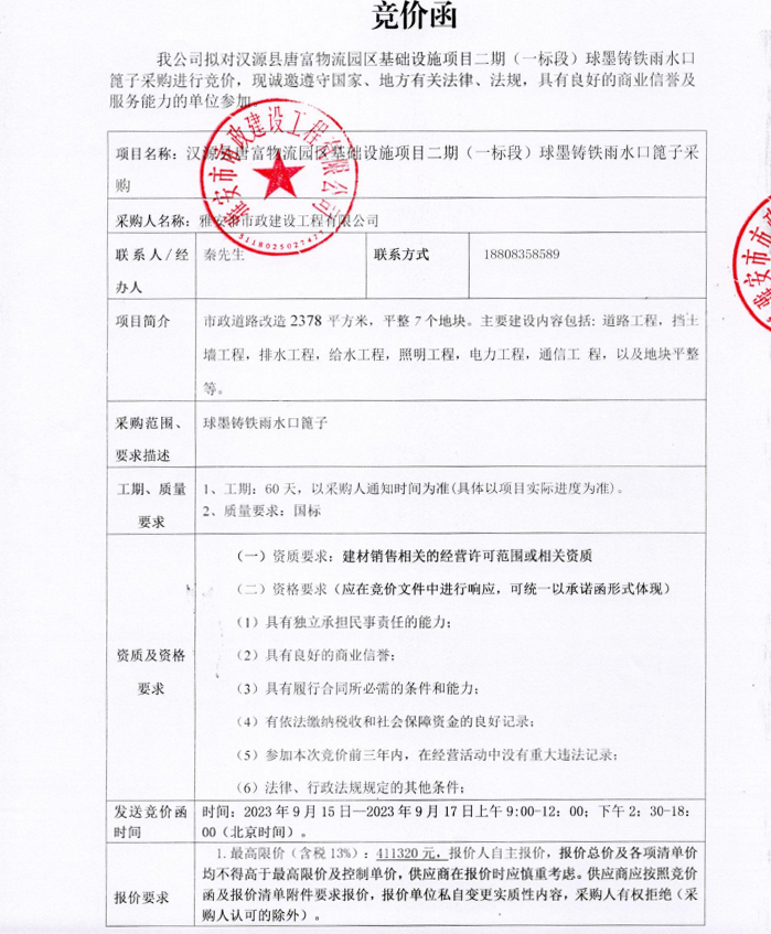 漢源縣唐富物流園區(qū)基礎(chǔ)設(shè)施項目二期(一標段)球墨鑄鐵雨水口篦子采購競價公告