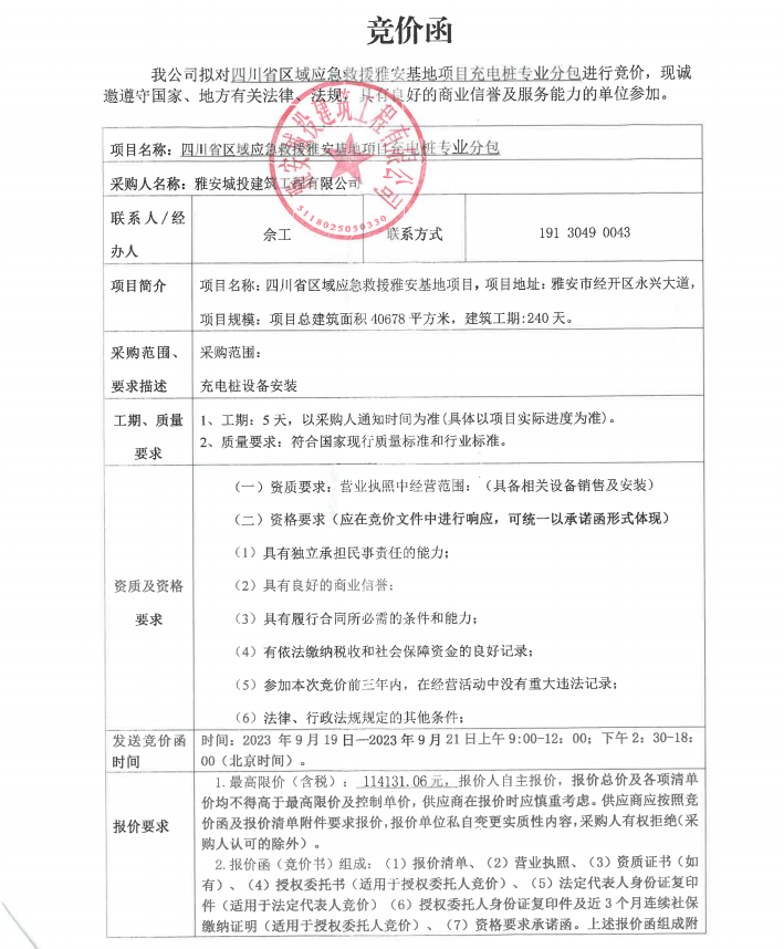 四川省區(qū)域應(yīng)急救援雅安基地項目充電樁專業(yè)分包競價公告