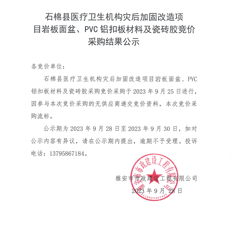 石棉縣醫(yī)療衛(wèi)生機構災后加固改造項目巖板面盆、PVC鋁扣板材料及瓷磚膠競價采購結果公示