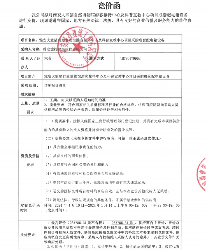 雅安大熊貓自然博物館游客接待中心及科普宣教中心項目成套配電箱設(shè)備競價公告