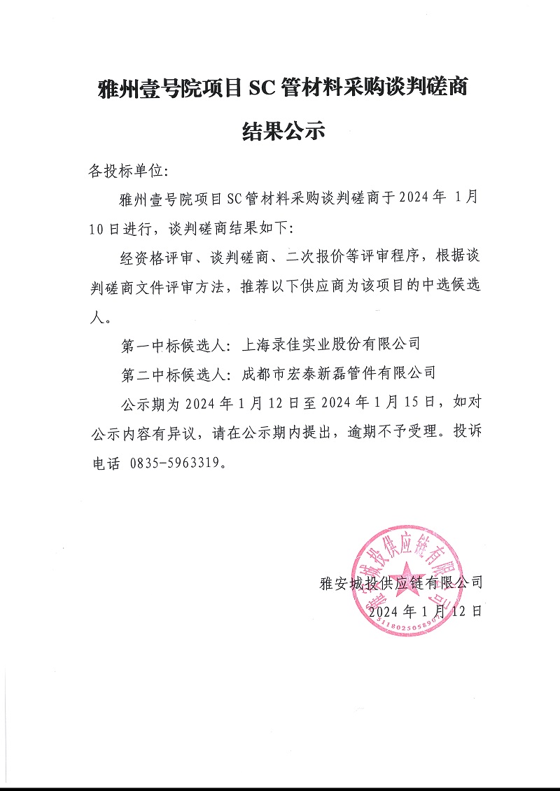 雅州壹號院項目SC管材料采購談判磋商結果公示