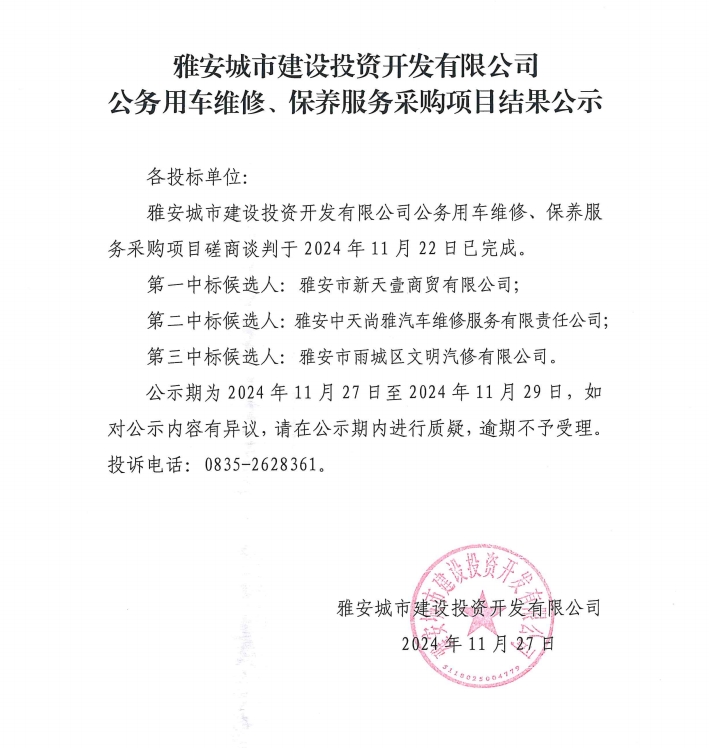 雅安城市建設(shè)投資開(kāi)發(fā)有限公司公務(wù)用車(chē)維修、保養(yǎng)服務(wù)采購(gòu)項(xiàng)目結(jié)果公示