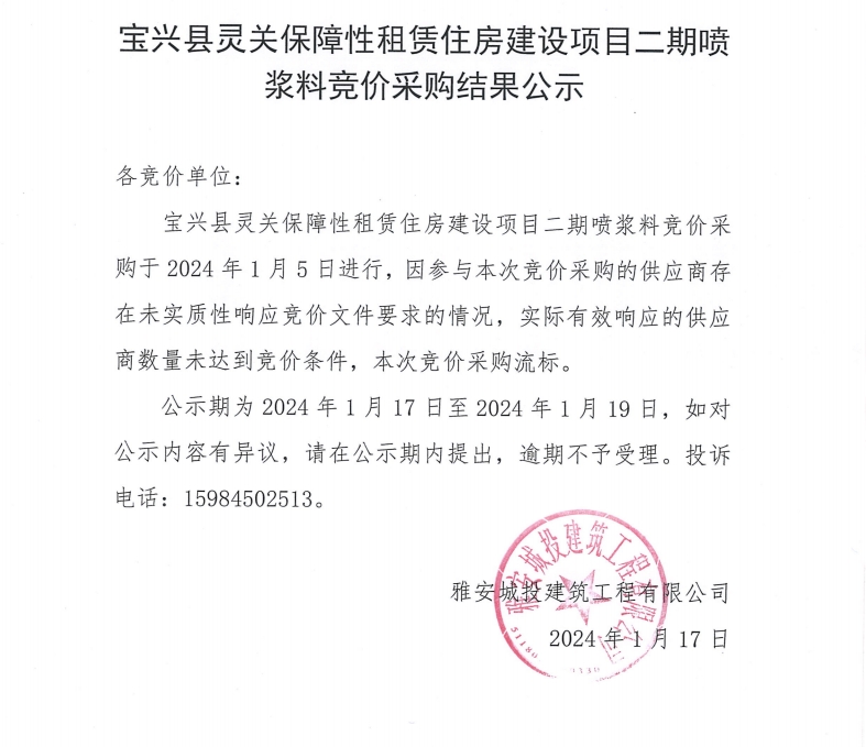 寶興縣靈關(guān)保障性租賃住房建設(shè)項(xiàng)目二期噴漿料競(jìng)價(jià)采購結(jié)果公示