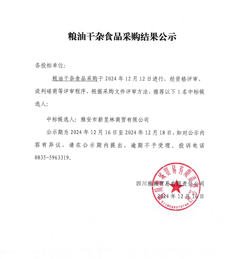 糧油干雜食品采購結(jié)果公示