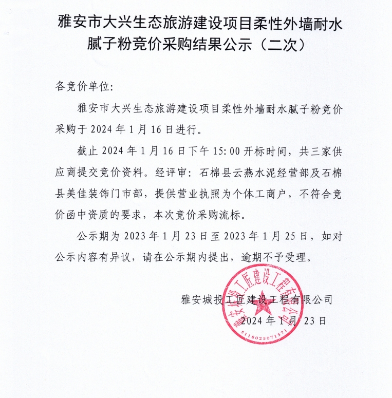 雅安市大興生態(tài)旅游建設(shè)項目柔性外墻耐水膩子粉競價采購(第二次)結(jié)果公示