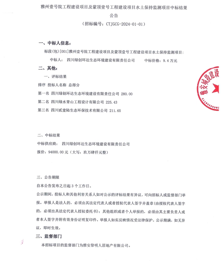 雅州壹號(hào)院工程建設(shè)項(xiàng)目及蒙頂壹號(hào)工程建設(shè)項(xiàng)目水土保持監(jiān)測(cè)項(xiàng)目中標(biāo)結(jié)果公告