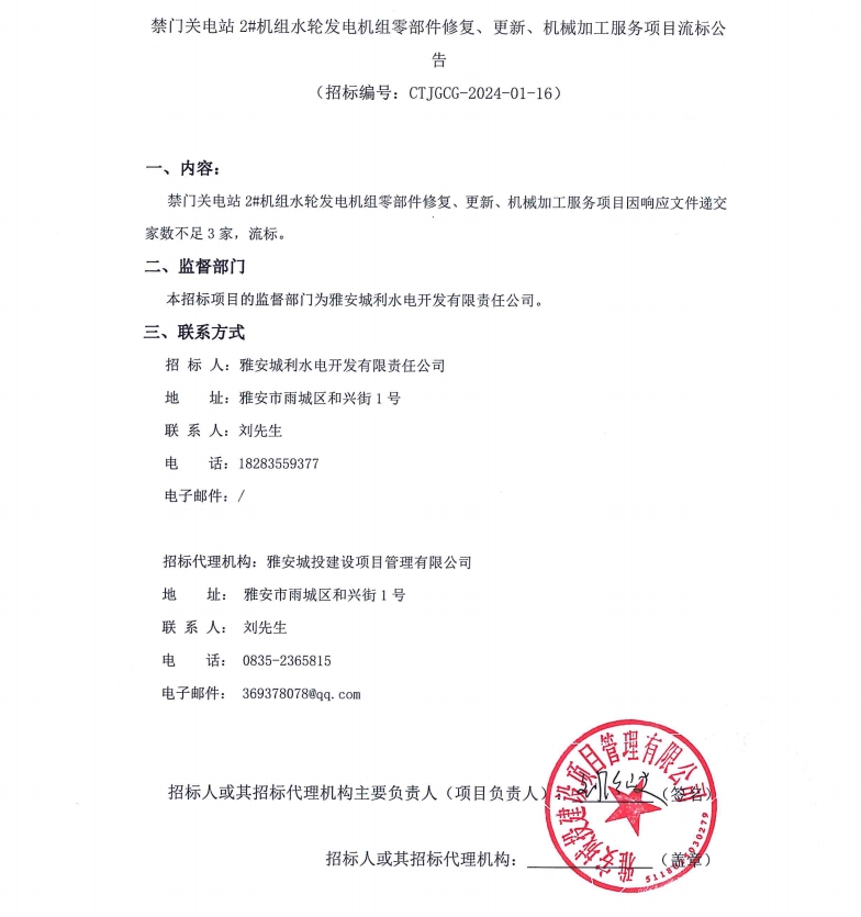 禁門關電站2#機組水輪發(fā)電機組零部件修復、更新、機械加工服務項目流標公告