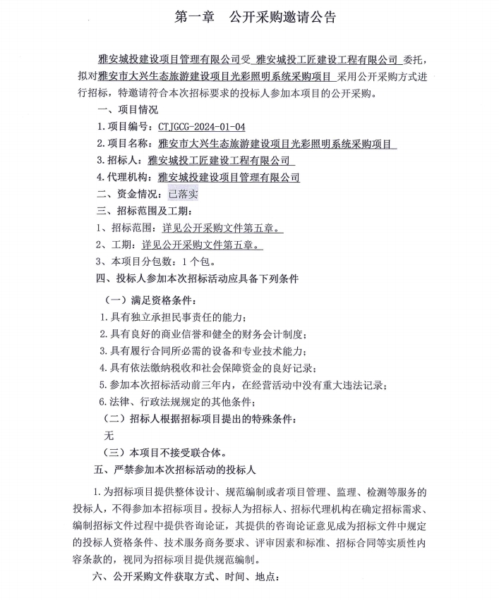雅安市大興生態(tài)旅游建設(shè)項(xiàng)目光彩照明系統(tǒng)采購項(xiàng)目公開采購邀請(qǐng)公告