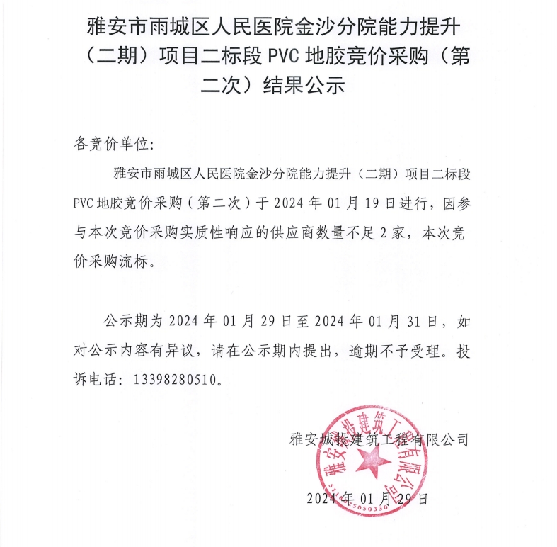雅安市雨城區(qū)人民醫(yī)院金沙分院能力提升(二期)項目二標(biāo)段PVC地膠競價采購(第二次)結(jié)果公示