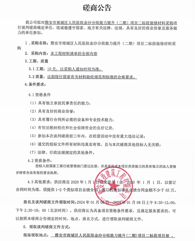 雅安市雨城區(qū)人民醫(yī)院金沙分院能力提升(二期)項(xiàng)目二標(biāo)段裝修材料采購(gòu)談判磋商公告