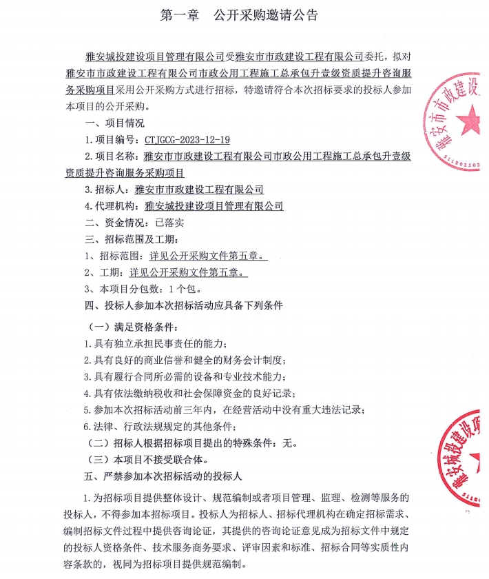 雅安市市政建設(shè)工程有限公司市政公用工程施工總承包升壹級(jí)資質(zhì)提升咨詢(xún)服務(wù)采購(gòu)項(xiàng)目公開(kāi)采購(gòu)邀請(qǐng)公告