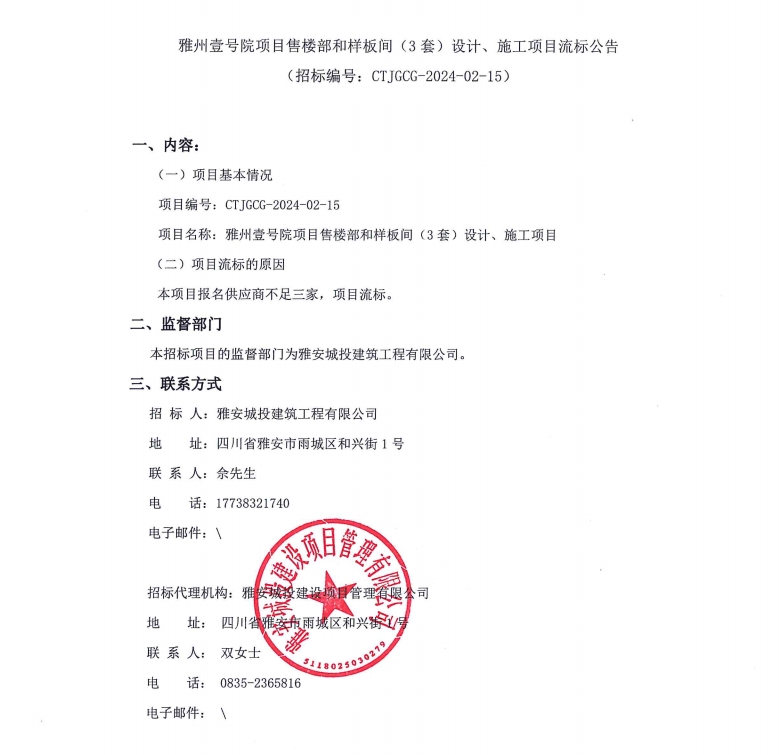 雅州壹號院項(xiàng)目售樓部和樣板間(3套)設(shè)計、施工項(xiàng)目流標(biāo)公告