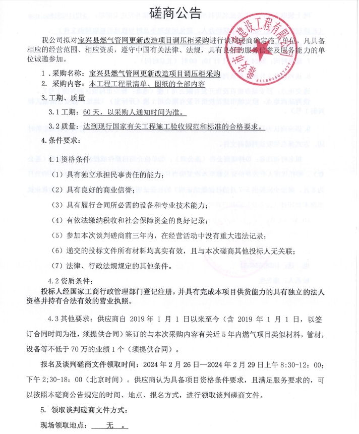 寶興縣燃氣管網(wǎng)更新改造項目調(diào)壓柜采購談判磋商公告