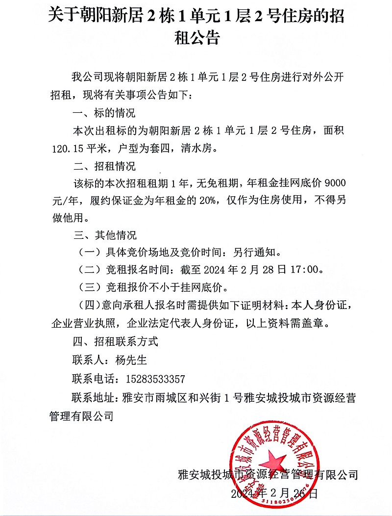 關(guān)于朝陽新居2棟1單元1層2號(hào)住房的招租公告