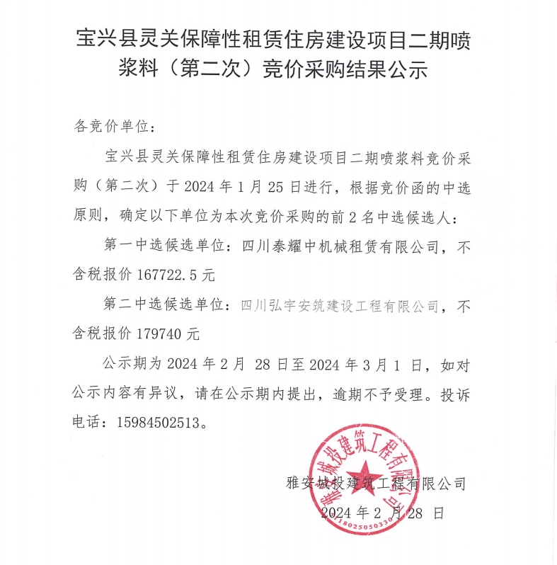 寶興縣靈關(guān)保障性租賃住房建設(shè)項(xiàng)目二期噴漿料(第二次)競價(jià)采購結(jié)果公示