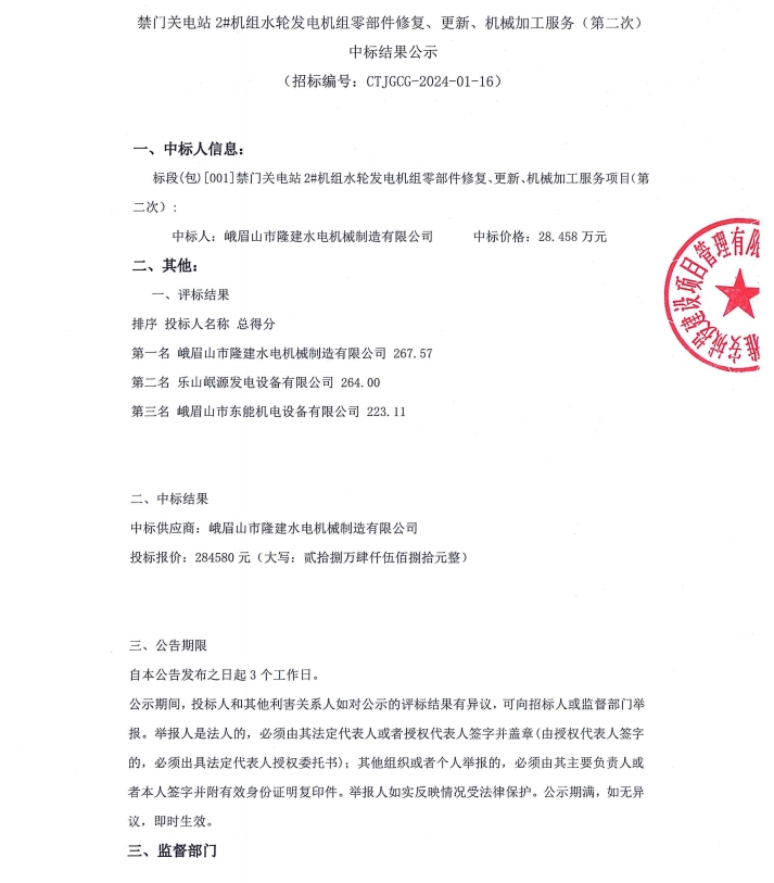 禁門(mén)關(guān)電站2#機(jī)組水輪發(fā)電機(jī)組零部件修復(fù)、更新、機(jī)械加工服務(wù)(第二次)中標(biāo)結(jié)果公示