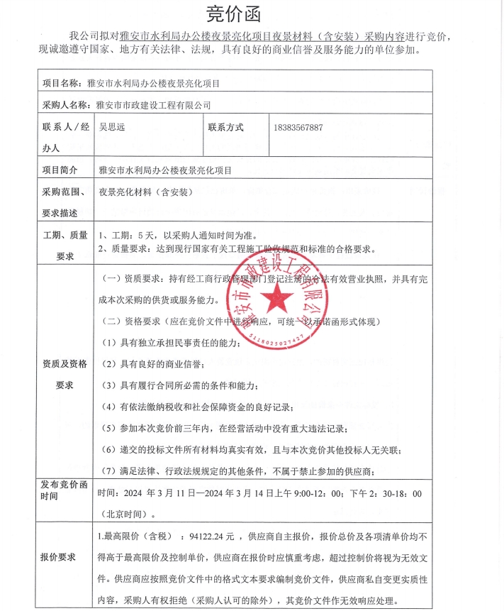 雅安市水利局辦公樓夜景亮化項(xiàng)目夜景材料(含安裝)采購內(nèi)容競價公告