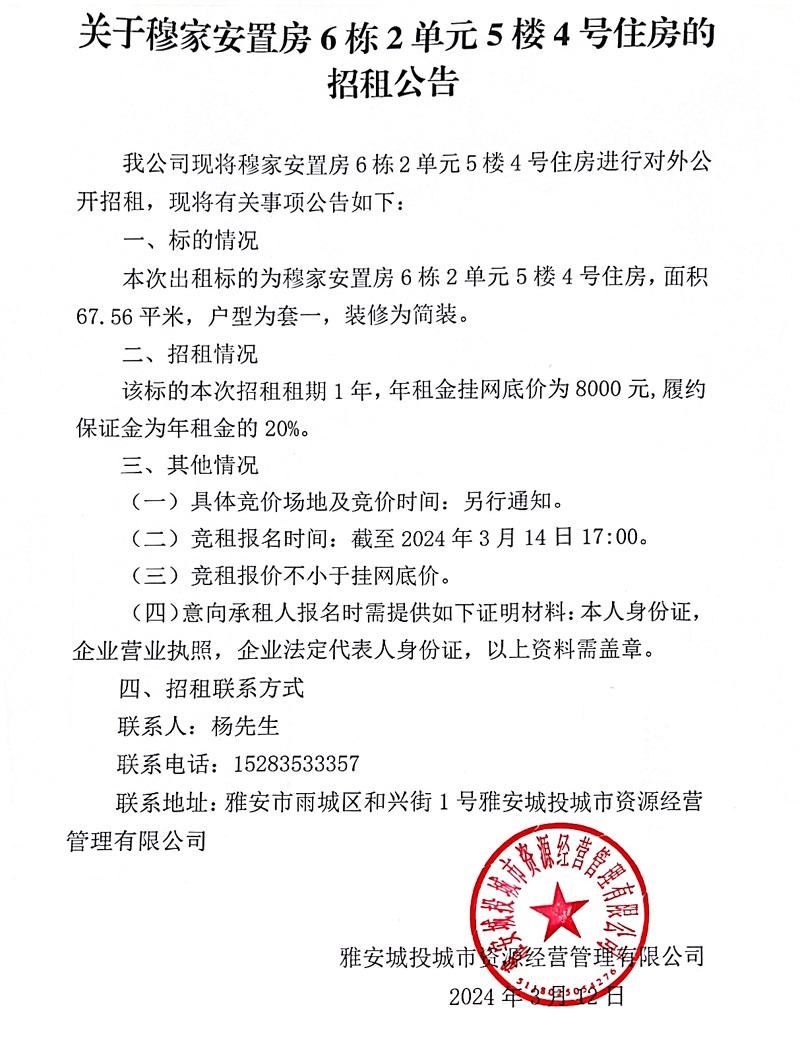 關(guān)于穆家安置房6棟2單元5樓4號住房的招租公告