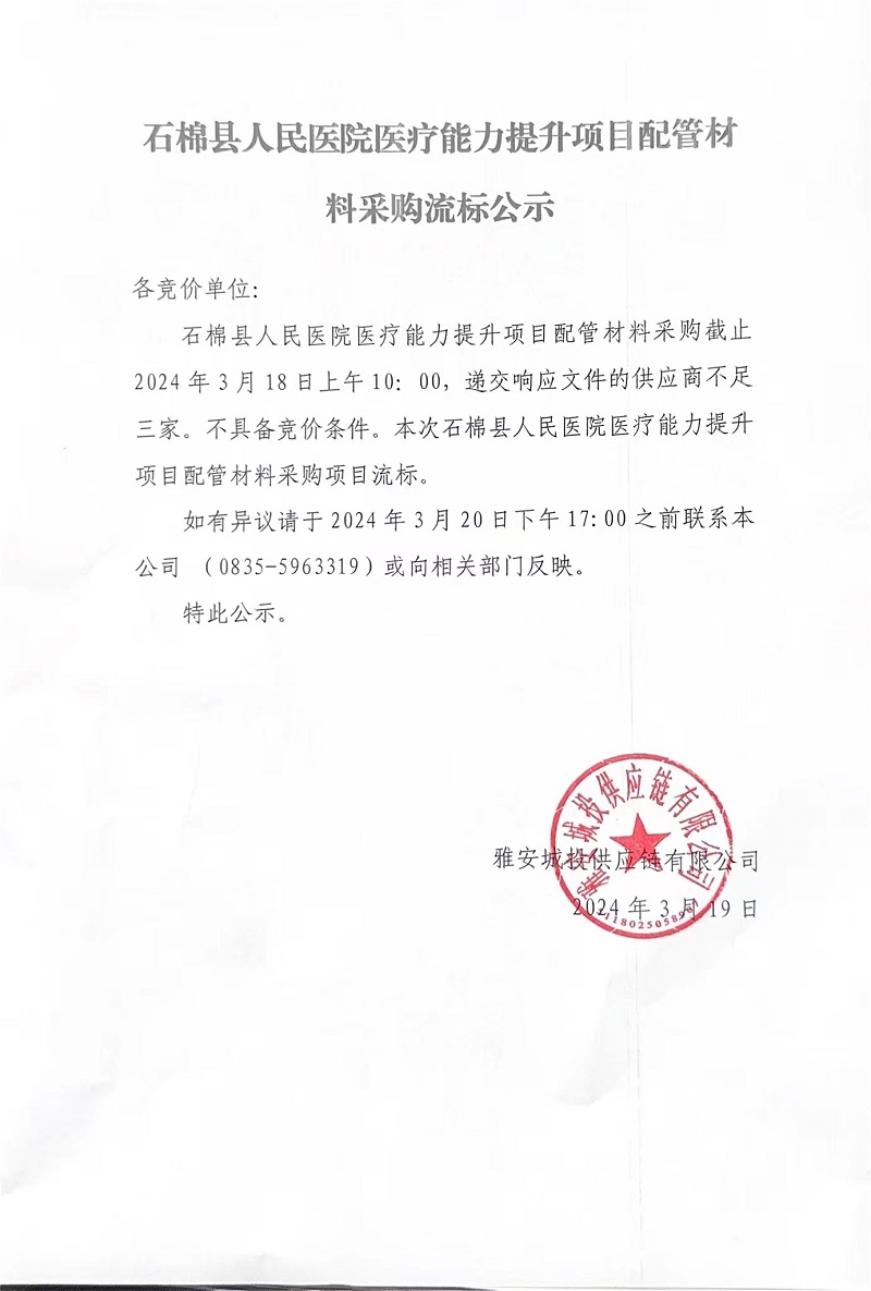 石棉縣人民醫(yī)院醫(yī)療能力提升項(xiàng)目配管材料采購(gòu)流標(biāo)公示