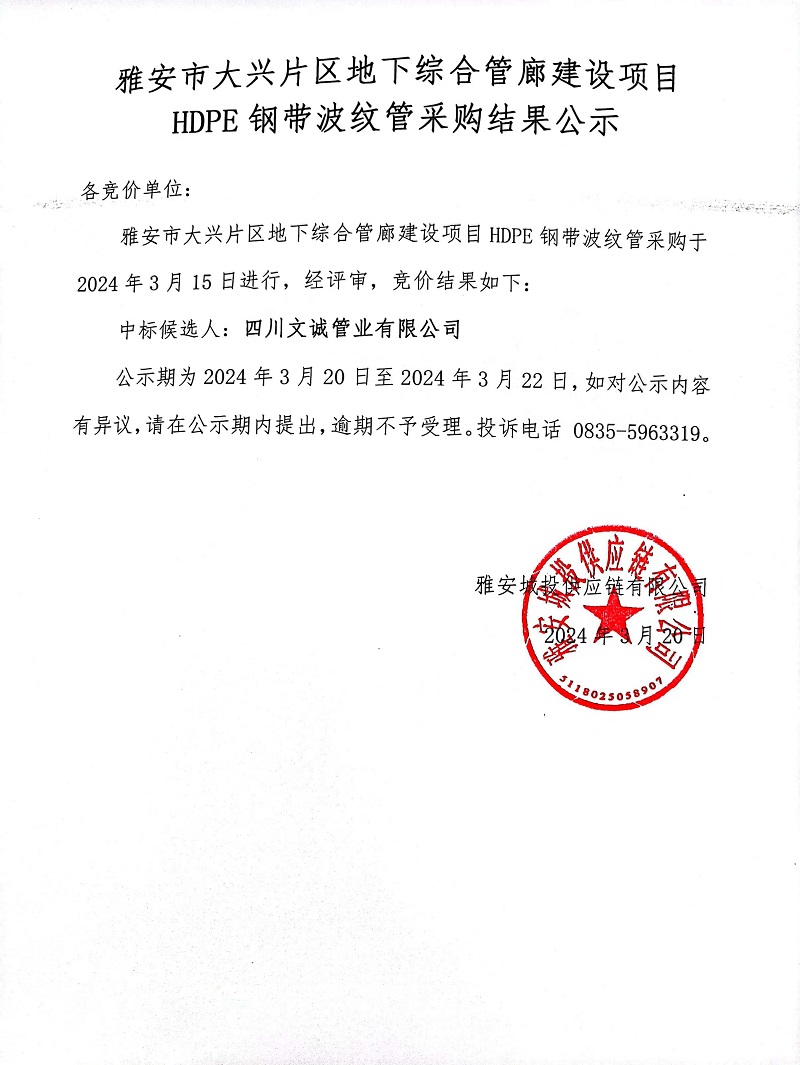 雅安市大興片區(qū)地下綜合管廊建設(shè)項目HDPE鋼帶波紋管采購結(jié)果公示