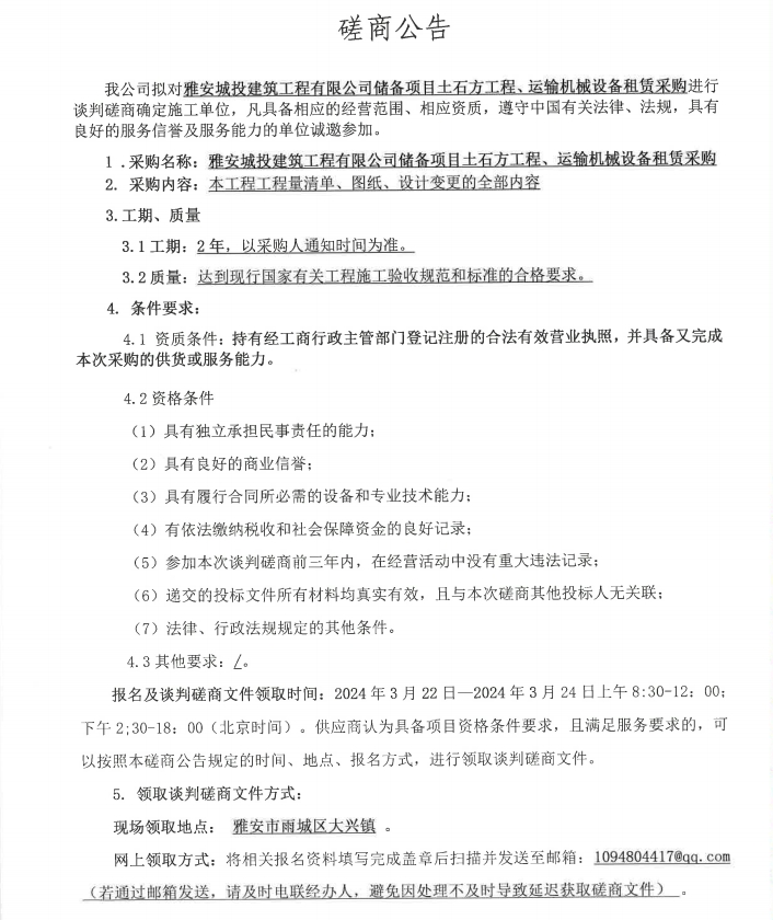 雅安城投建筑工程有限公司儲(chǔ)備項(xiàng)目土石工程、運(yùn)輸機(jī)械設(shè)備租賃采購(gòu)磋商公告