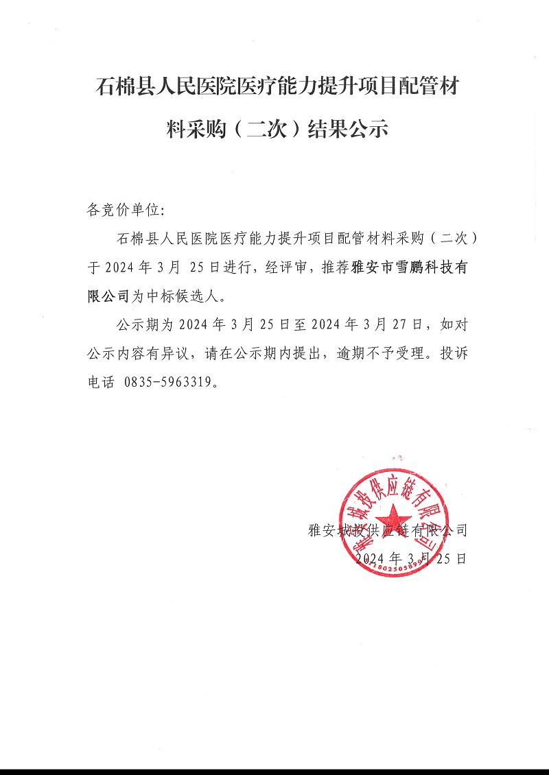 石棉縣人民醫(yī)院醫(yī)療能力提升項(xiàng)目配管材料采購(gòu)(二次)結(jié)果公示