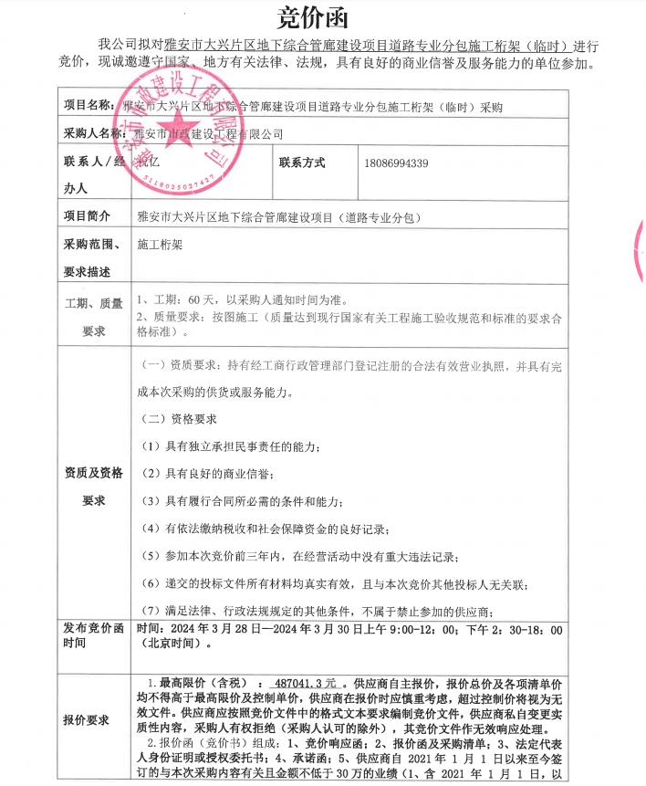 雅安市大興片區(qū)地下綜合管廊建設(shè)項(xiàng)目道路專業(yè)分包施工桁架(臨時(shí))采購(gòu)競(jìng)價(jià)公告