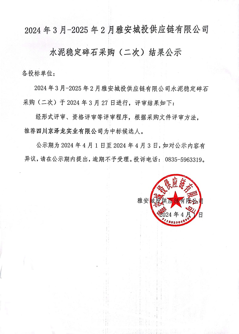 2024年3月-2025年2月雅安城投供應(yīng)鏈有限公司水泥穩(wěn)定碎石采購(gòu)(二次)結(jié)果公示