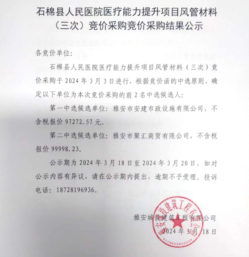 石棉縣人民醫(yī)院醫(yī)療能力提升項(xiàng)目風(fēng)管材料(三次)競(jìng)價(jià)采購(gòu)競(jìng)價(jià)采購(gòu)結(jié)果公示