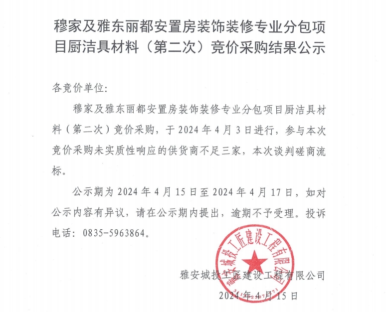 穆家及雅東麗都安置房裝飾裝修專業(yè)分包項目廚具材料(第二次)競價采購結果公示