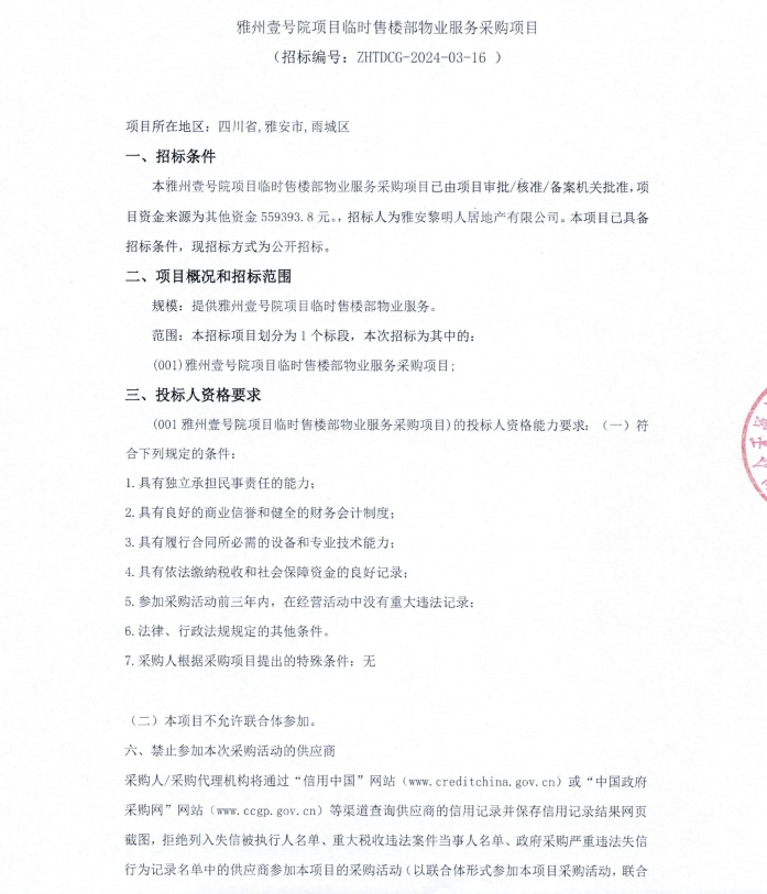 雅州壹號(hào)院項(xiàng)目臨時(shí)售樓部物業(yè)服務(wù)采購項(xiàng)目公告