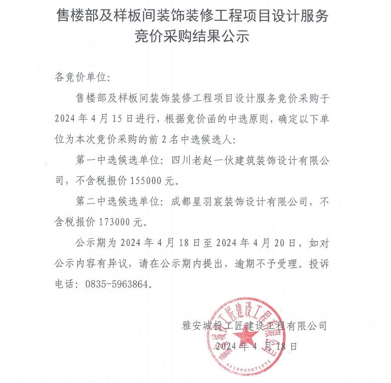 售樓部及樣板間裝飾裝修工程項(xiàng)目設(shè)計(jì)服務(wù)競(jìng)價(jià)采購(gòu)結(jié)果公示