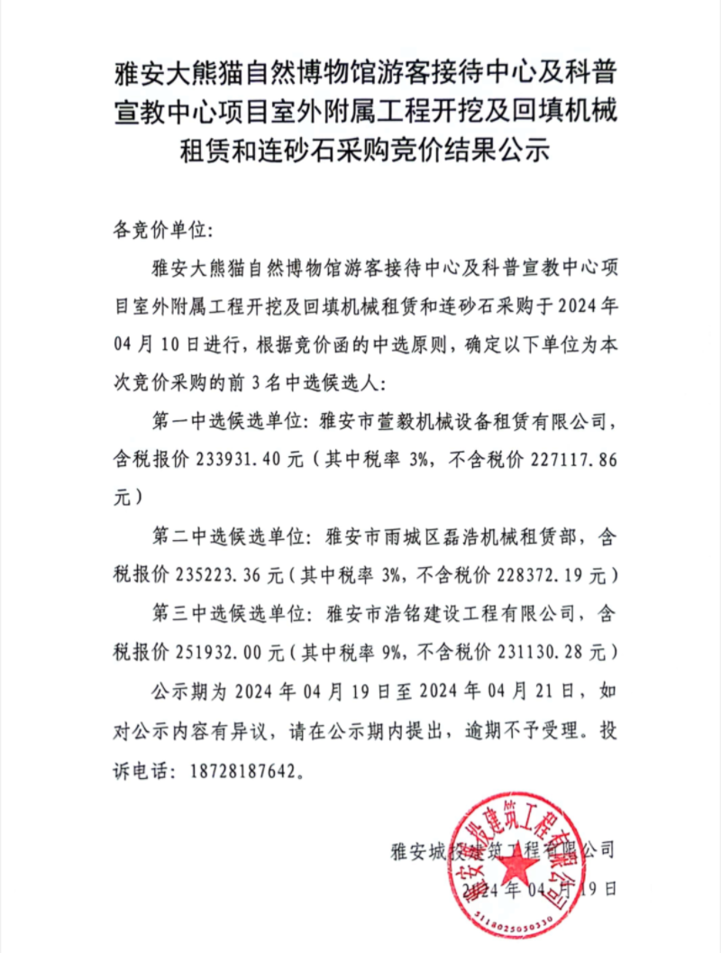 雅安大熊貓自然博物館游客接待中心及科普宣教中心項(xiàng)目室外附屬工程開挖及回填機(jī)械租賃和連砂石采購競價結(jié)果公示