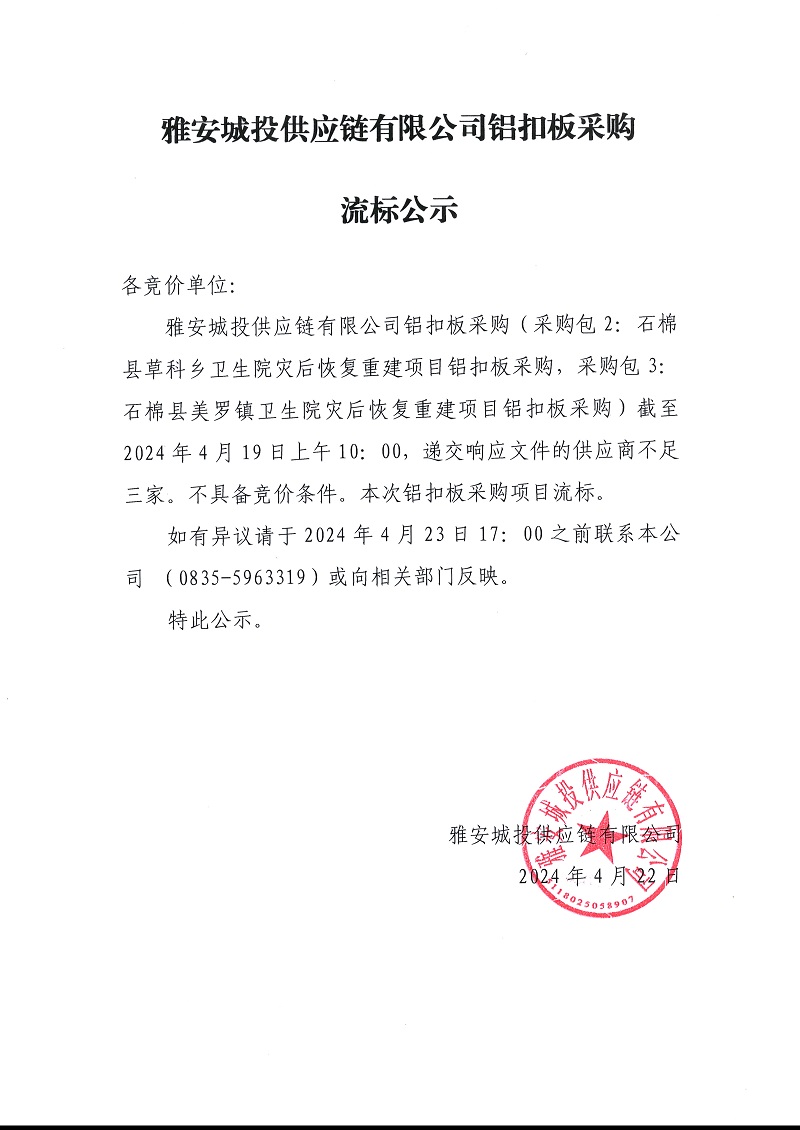 雅安城投供應(yīng)鏈有限公司鋁扣板采購(gòu)流標(biāo)公示