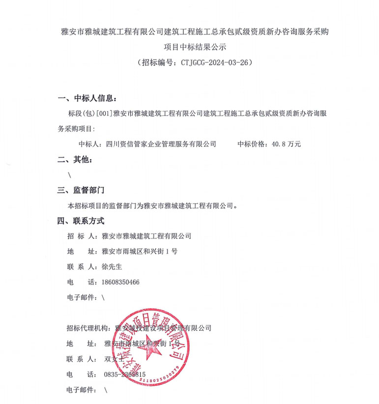 雅安市雅城建筑工程有限公司建筑工程施工總承包貳級資質(zhì)新辦咨詢服務(wù)采購項目中標(biāo)結(jié)果公示