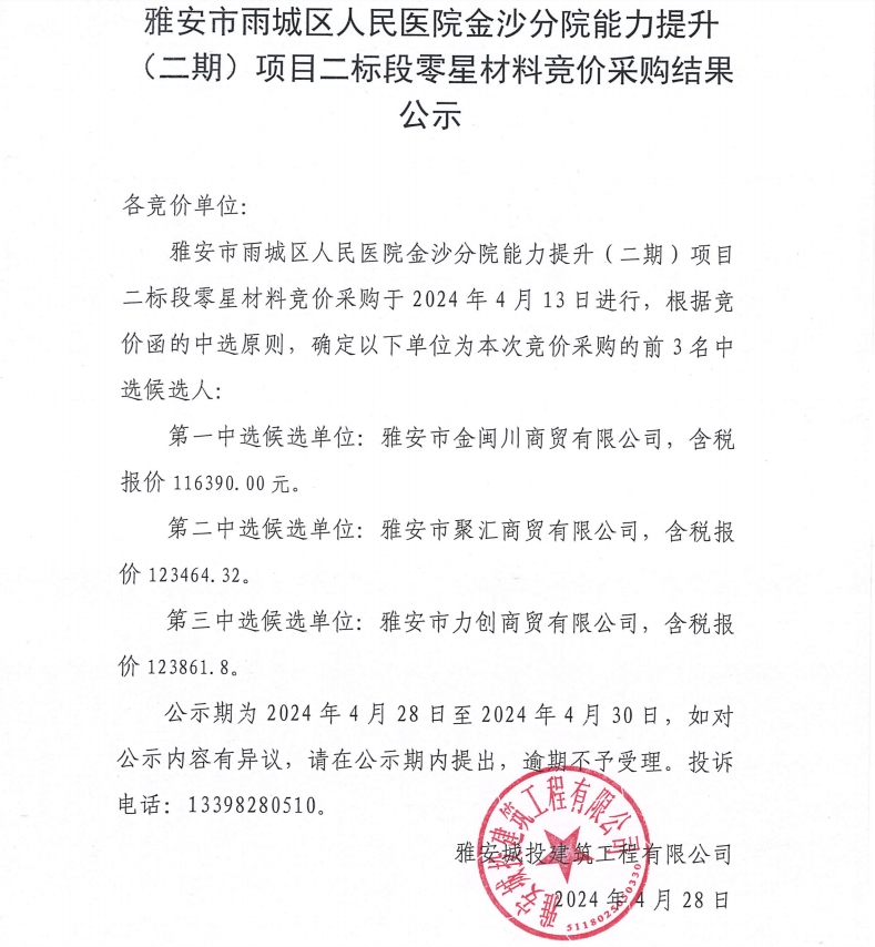 雅安市雨城區(qū)人民醫(yī)院金沙分院能力提升(二期)項目二標(biāo)段零星材料競價采購結(jié)果公示