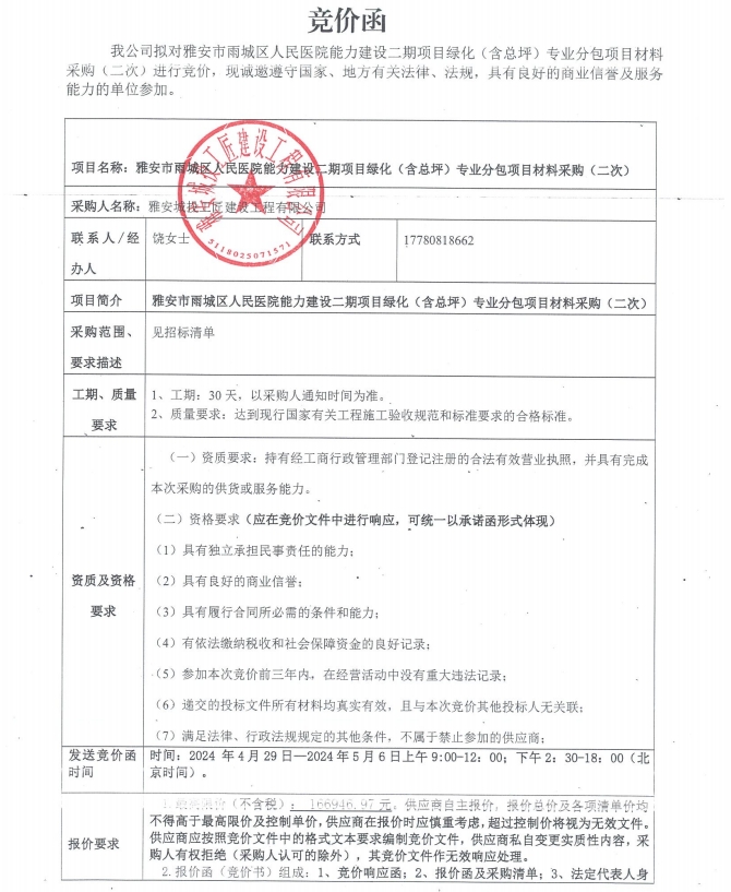 競價函-雅安市雨城區(qū)人民醫(yī)院能力建設(shè)二期項(xiàng)目綠化(含總坪)專業(yè)分包項(xiàng)目材料采購(二次)
