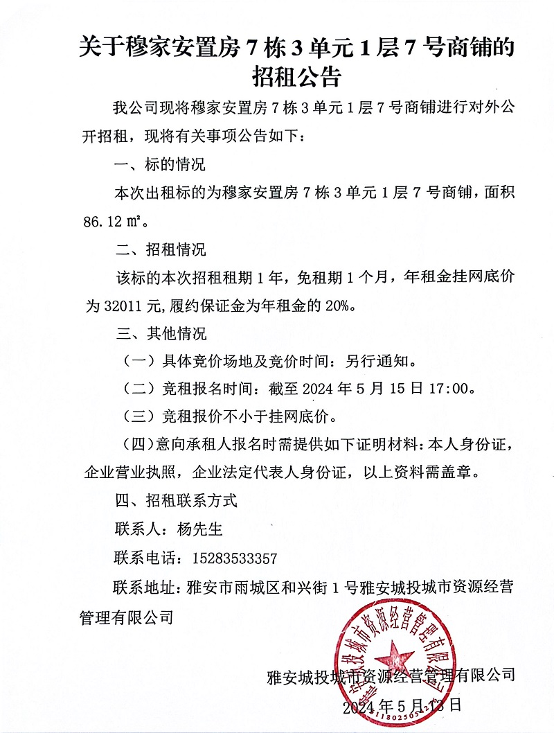 關(guān)于穆家安置房7棟3單元1層7號商鋪的招租公告